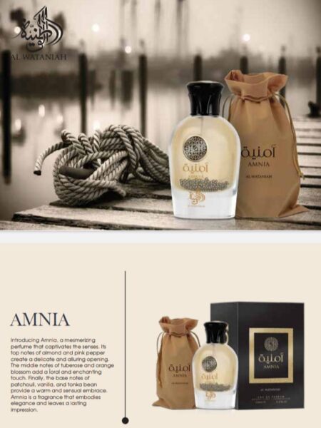 Amnia : هو عطر للجنسين،ويتكون من المكونات العليا هي اللوز والفلفل الوردي، وقلب العطر يتضمن مسك الروم وزهر البرتقال، وقاعدة العطر تتكون من الأخشاب