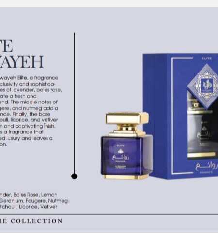 Rawae'e Elite - روائع ايليت : المقدمة، يفتتح العطر بنفحات منعشة من الخزامى والورد والليمون. أما قلب العطر فيضم مزيجًا عطريًا من جوزة الطيب وإبرة الراعي. وتختتم الرائحة في القاعدة بنفحات ترابية ودافئة من الباتشولي ونجيل الهند.