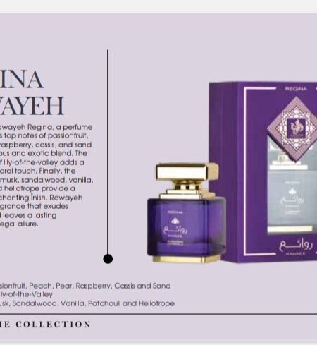 Rawae'e Regina - روائع ريجينا : افتتاحية من فاكهة العاطفة، الخوخ، الكمثرى، والتوت الأسود. بينما يتكون قلب العطر من زنابق الوادي، وتتركز المكونات الأساسية على المسك، خشب الصندل، الفانيليا، والباتشولي