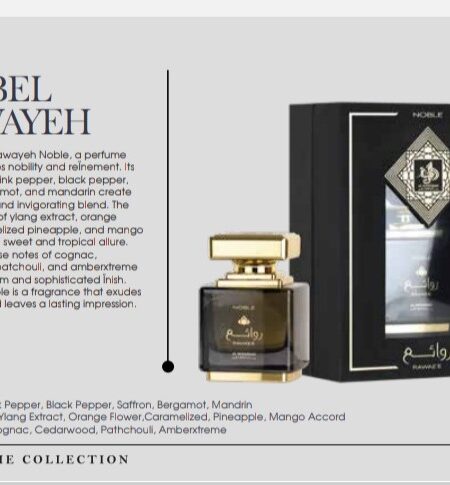 Rawae'e Noble - روائع نوبل : تتكون من نفحات عليا منعشة وحارة من الفلفل الأسود، الفلفل الوردي، البرغموت، والزعفران. قلب العطر يمزج بين روائح حلوة واستوائية مثل المانجو والأناناس مع زهر البرتقال والإيلنغ. أما قاعدة العطر فتتميز بدفء ونعومة الكونياك وخشب الأرز مع لمسات من الباتشولي والعنبر