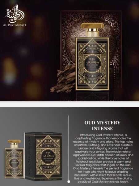 Oud Mystery Intense : جوزة الطيب، الزعفران، واللافندر في مقدمة العطر، بينما يتكون قلبه من خشب العود، وتستقر قاعدته على البخور، المسك، والعنبر. يُصنف العطر على أنه خشبي حار للجنسين