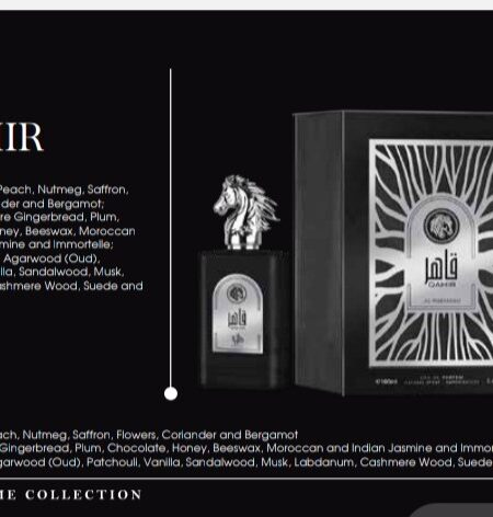 قاهر : مقدمة العطر تتكون من الخوخ، جوزة الطيب، الزعفران، الزهور، الكزبرة، والبرغموت. أما قلب العطر فيضم الزنجبيل، البرقوق، الشوكولاتة، العسل، وشمع العسل، والياسمين الهندي، والإيفرجرين. بينما تتكون قاعدة العطر من خشب العود (العود)، الباتشولي، الفانيليا، خشب الصندل، المسك، اللبان، خشب الكشمير، والجلد المدبوغ.