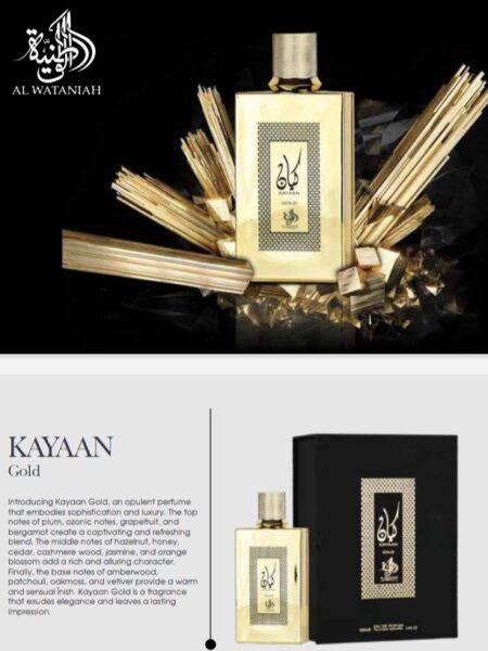 كيان جولد : المكونات بالبرقوق والأوزون والجريب فروت والبرغموت في المقدمة، ومن ثم قلب عطري غني بالبندق والعسل وخشب الأرز والكشمير والياسمين وزهر البرتقال، وينتهي بقاعدة مكونة من نفحات المسك والعنبر والأخشاب