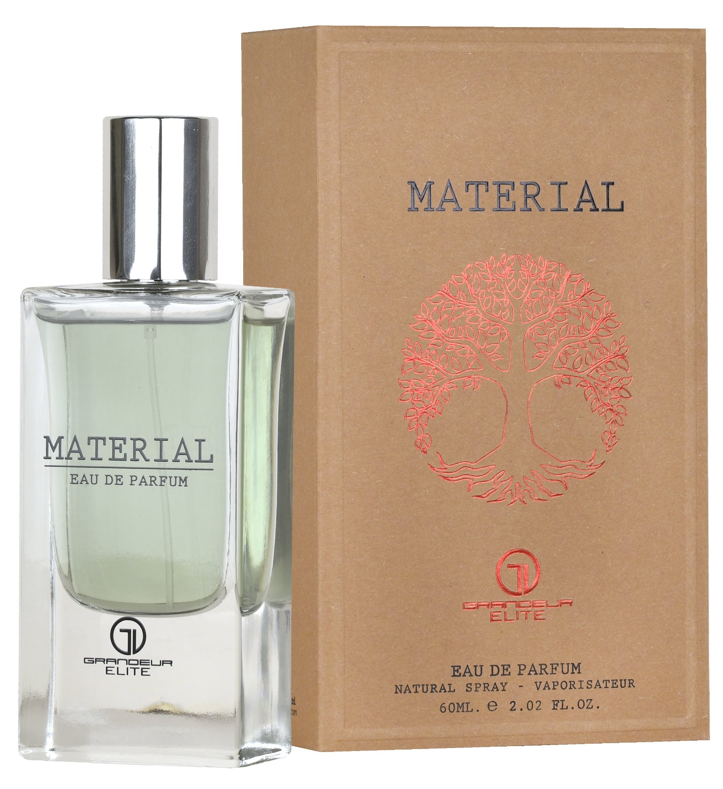 MATERIAL – ماتريال : للرجال، فتبدأ بمكونات عليا من الشيح، البرغموت، اللافندر، الهيل، والنعناع، وقلب من زهر البرتقال، القرفة، والكراوية، وقاعدة من خشب الصندل، التونكا، الفانيليا، خشب الأرز، والعنبر